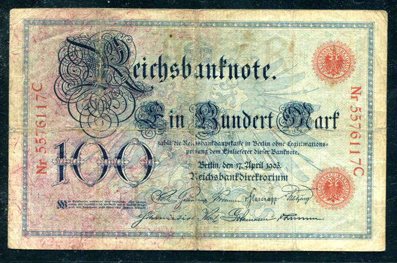 LIQUIDATIONSPOSTEN.1903 Reichsbanknote 100 Mark. Rosenberg Katalog Nr. 20 mehrmals gefaltet.
