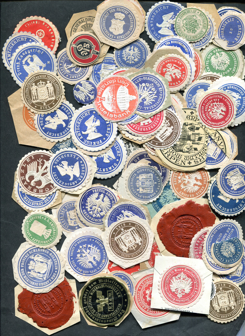 Prägesiegelmarken über 100 Stück teils aus Briefen ausgeschnitten, wohl aus den Kriegsjahren, von Städten, Behörden, usw., auch mit Hakenkreuz, in unterschiedlicher Erhaltung. Ein selten angebotener Posten.