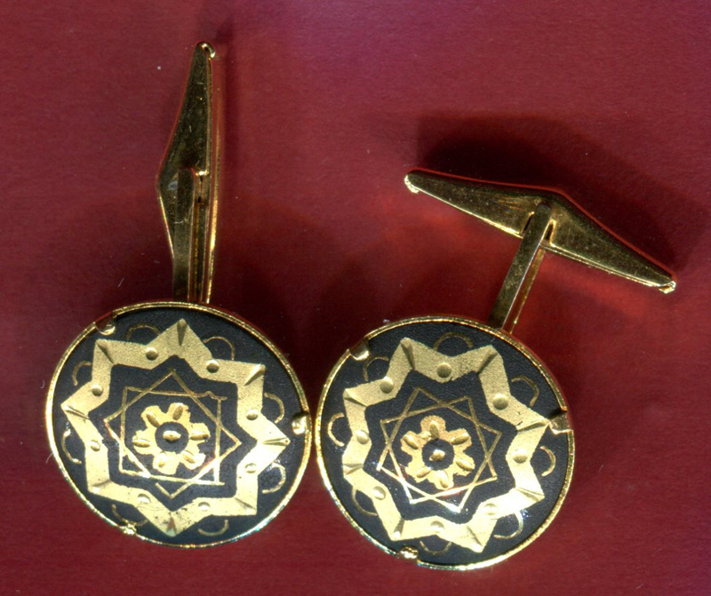 2 Mannschettenknöpfe. MOTIV Stern mit 8 Spitzen und mehr auf schwarzem Untergrund, vergoldet, Bitte ansehen. Nie getragen. Top. Alle 3 Ergänzungslose passen zusammen.
