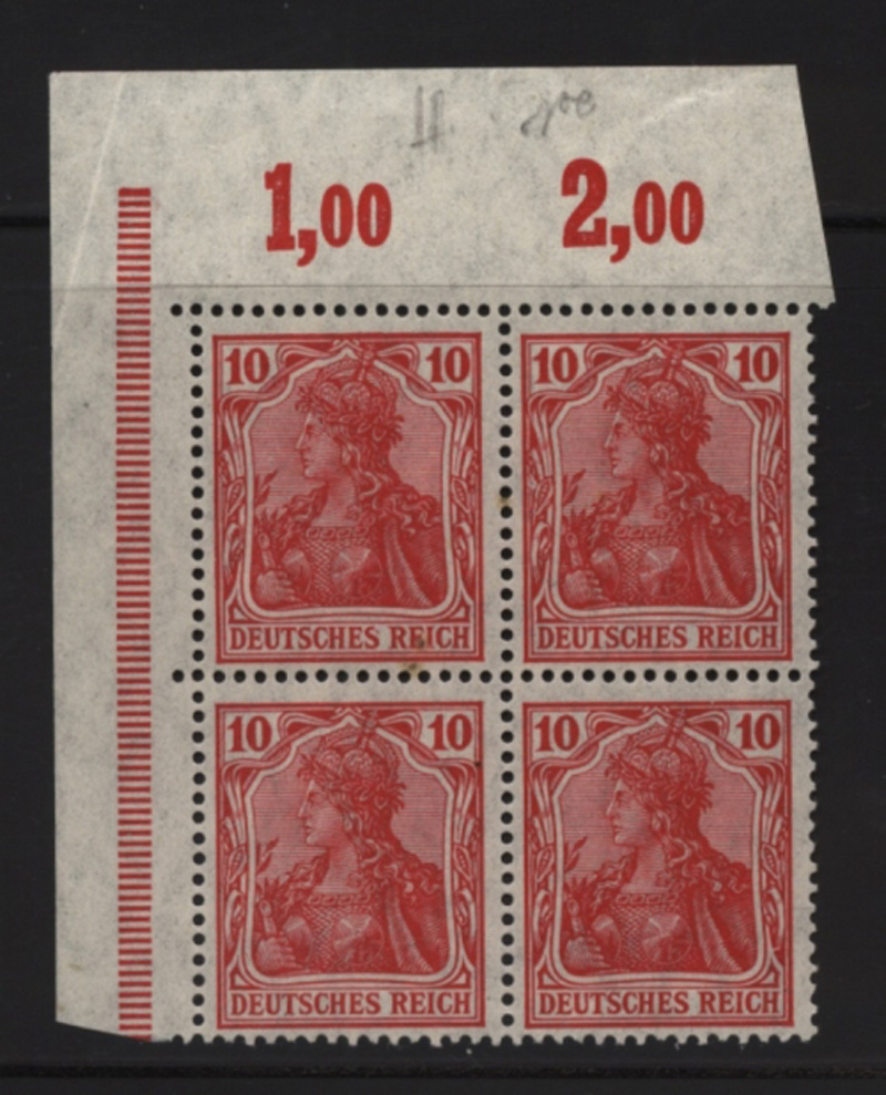 1915 Mi.Nr. 86 IIa , , 10 Pfennig Germania, Platte, Ecke oben links, mit kleinen Gummifehlern, geprüft.