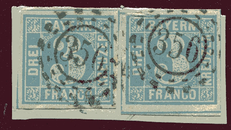 LIQUIDATIONSPOSTEN. 1849 Mi.Nr. 2 , Bayern 3 Kr. in blau, 2 Marken mit rotem Seidenfaden, mit offenem Mühlradstempel Nr. 356, breitrandig geschnitten.