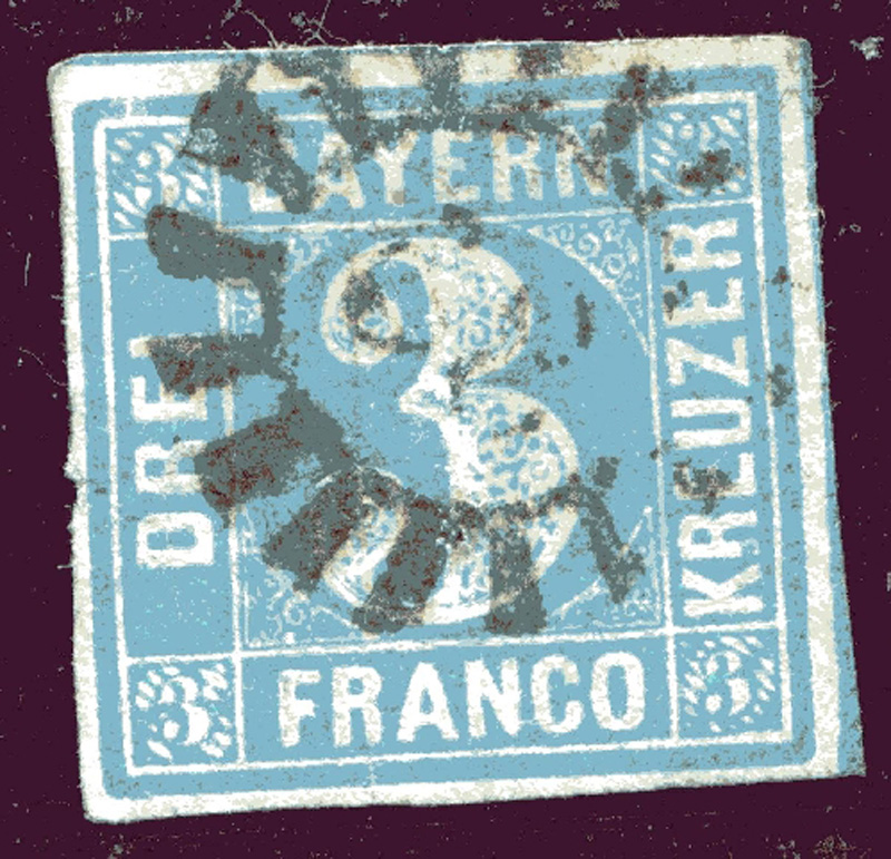 LIQUIDATIONSPOSTEN. 1849 Mi.Nr. 2 , Bayern 3 Kr. in blau, mit rotem Seidenfaden, mit geschlossenem Mühlradstempel Nr. ??, breitrandig geschnitten.