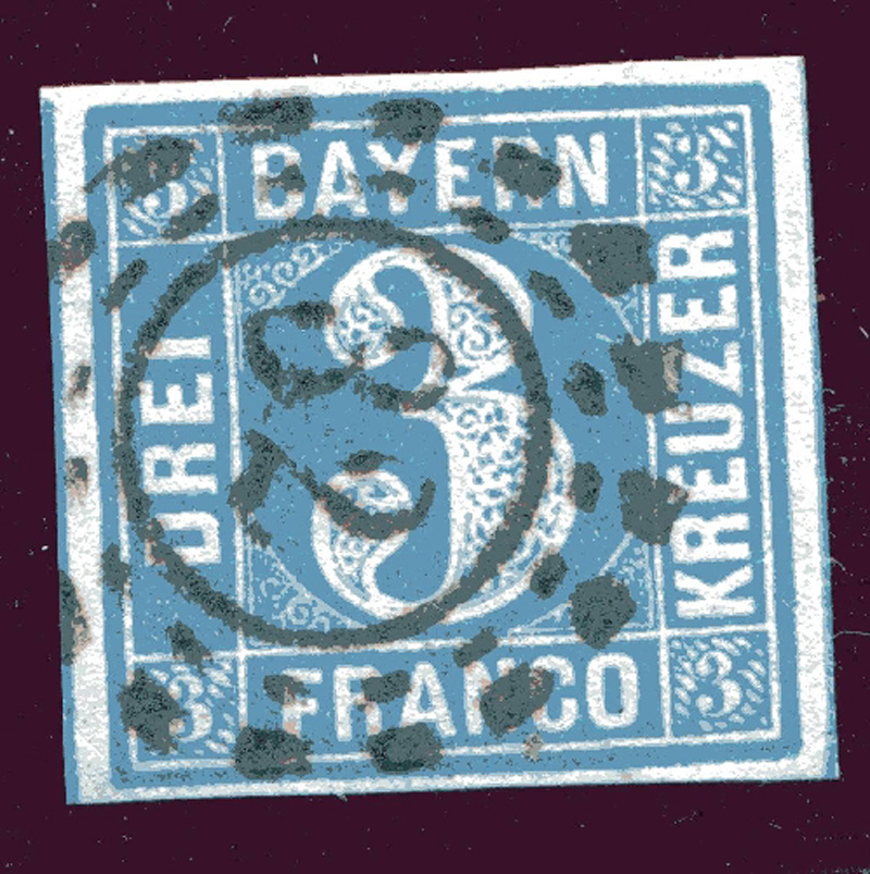 LIQUIDATIONSPOSTEN. 1849 Mi.Nr. 2 , Bayern 3 Kr. in blau, mit rotem Seidenfaden, mit offenem Mühlradstempel Nr. 32, breitrandig geschnitten.