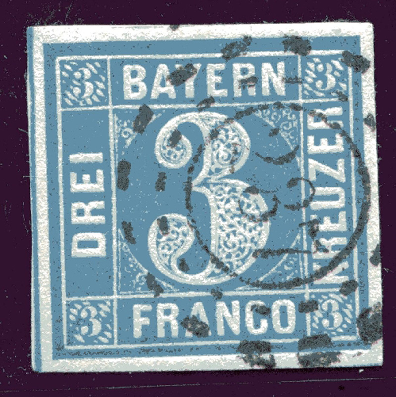 LIQUIDATIONSPOSTEN. 1849 Mi.Nr. 2 , Bayern 3 Kr. in blau, mit rotem Seidenfaden, mit offenem Mühlradstempel Nr. 237, breitrandig geschnitten.