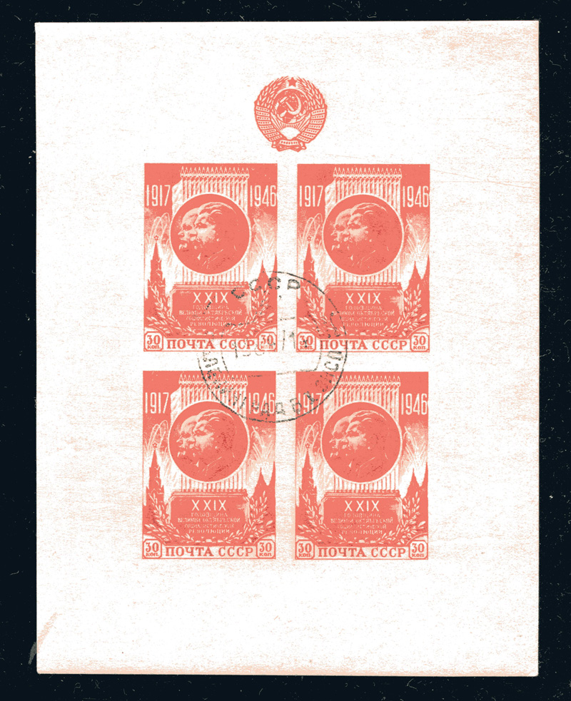 LIQUIDATIONSPOSTEN. 1947 Sowjetunion Block 9 , 29. Jahrestag der Oktoberrevolution, ungezähnt, mit Stempel. Auflage nur 100 000 Blocks.