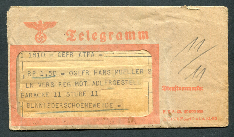 1944 TELEGRAMM Deutsche Reichspost. Haupttelegrafenamt Berlin. "geprüft ATPB (49)" Berlin-Niederschöneweide Bracke 11 Stube 11, im Original Telegramm Umschlag.
