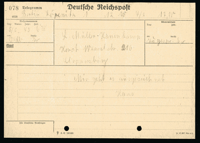 1943 TELEGRAMM Deutsche Reichspost. 5.2.1943 Uhr 6,30, ab Berlin Köpenick, nach Cloppenburg. Telegramm gelocht.