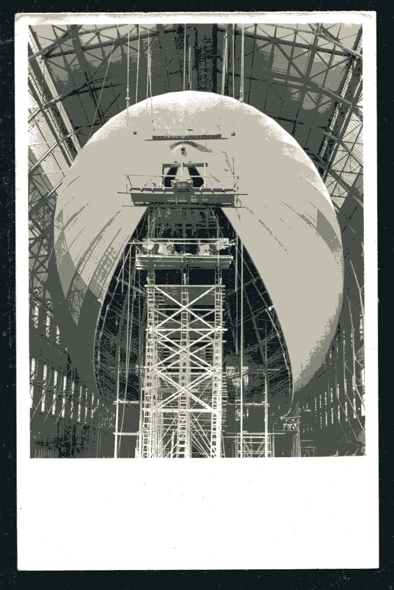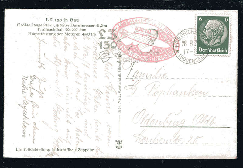 1937 Luftschiffbau Zeppelin LZ 130 im Bau auf Postkarte, befördert am 28.8.37 ab Friedrichshafen nach Oldenburg, mit rotem Zeppelin - Erinnerungsstempel.