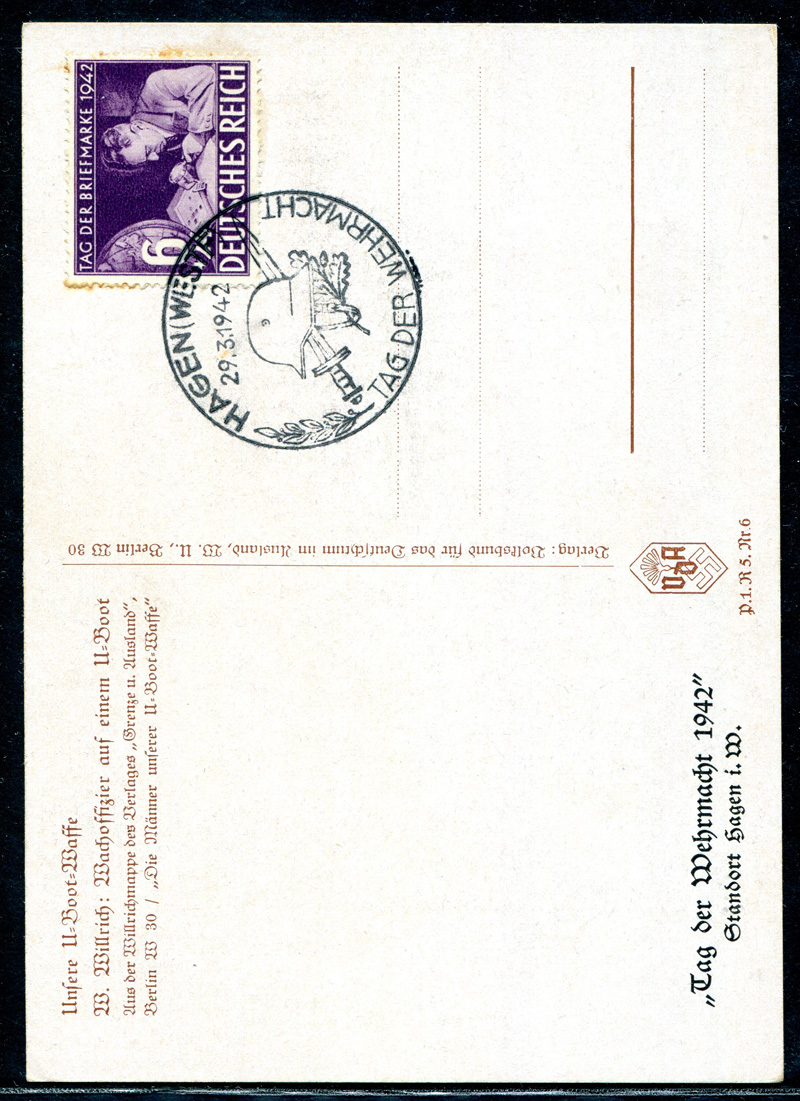WILLRICH KARTE. Wachoffizier auf einem U-Boot mit R-Marke Mi.Nr. 811 und Sonderstempel HAGEN (Westf) 29.3.1942 Tag der Briefmarke, nicht befördert.