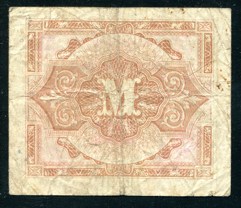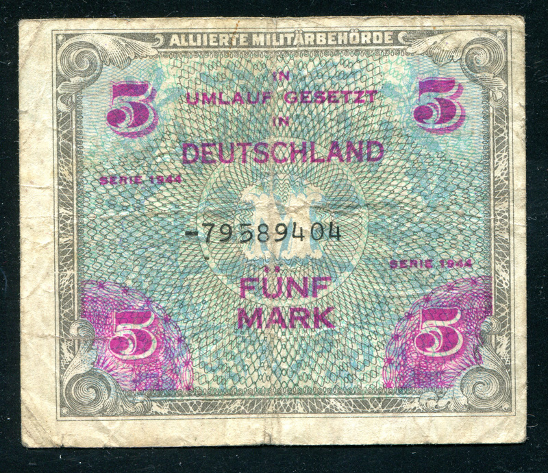 Serie 1944. In Umlauf gesetzt in Deutschland "Fünf Mark" 8stellig mit Nr. -79589404 gebraucht.
