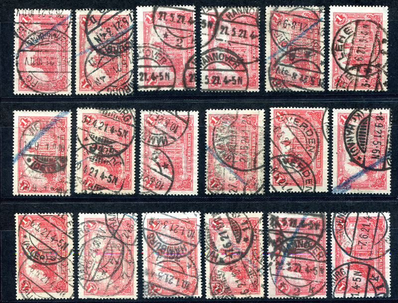 1920 Mi.Nr. 113A , Freimarke: Reichspostamt mit Flaggen. 1 Mark. 18 Marken, Farbe nicht geprüft.