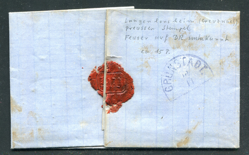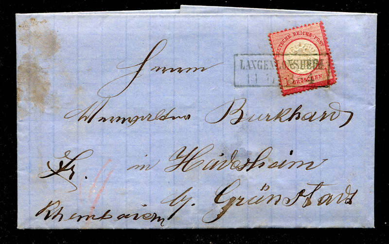 1872 Mi.Nr. 19 , , EF, mit K2 ab LANGENLONSHEIM nach Grünstadt. Rückseite mit Siegel und Halbkreisstempel GRÜNSTADT. Nach Feuserkatalog ca. 15 Punkte.