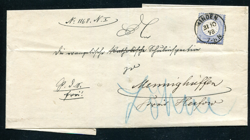 1872 Mi.Nr. 20 , , EF, ab MINDEN nach Menninghüffen bei Herford. Rückseite mit Dienstsiegelmarke.