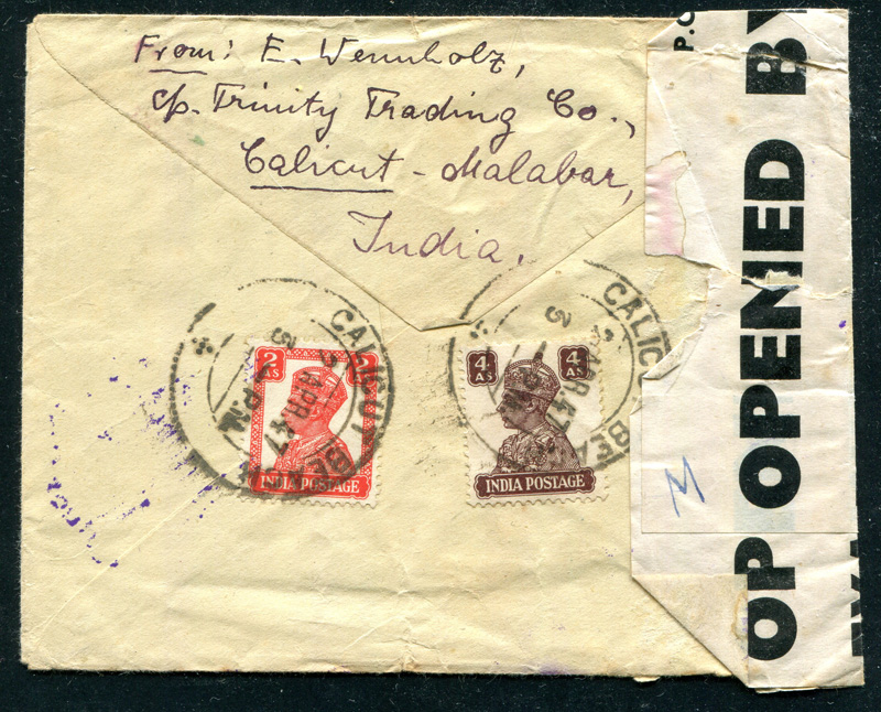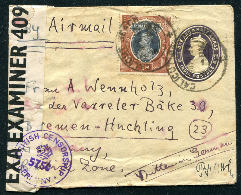 1947 Indien Ganzsache mit Zusatzfrankaturen, als Zensurbrief der britischen Zone, ab Calicut Beach 2. APR 47 nach Bremen.