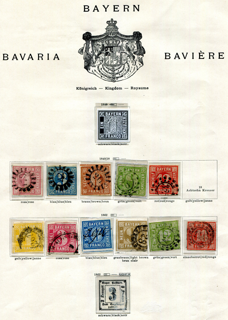 1849 bis 1862 Mi.Nr. 2/13 , Bayern. Zusammenstellung von 11 Marken teils mit Mühlradstempel, auf ein Vordruckblatt. Gute Qualität. Bitte ansehen.