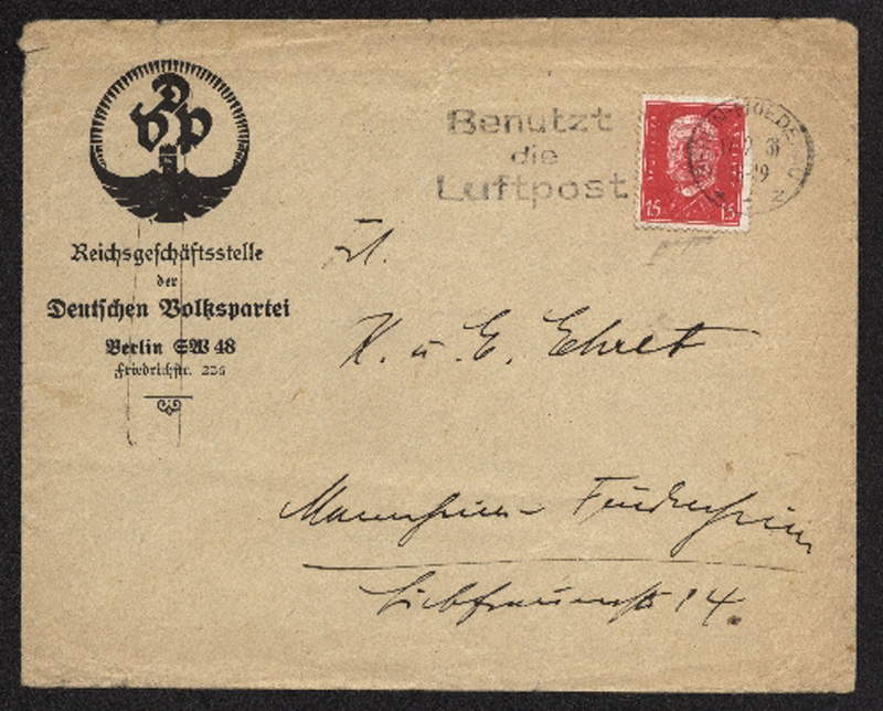 1928 Mi.Nr. 414 , , EF. Geschäftsbrief der Deutschen Volkspartei Berlin SW 48 mit Geschäftszeichen "DVP im schwarzem Adler", befördert nach Mannheim. Brief rs. beschrieben.