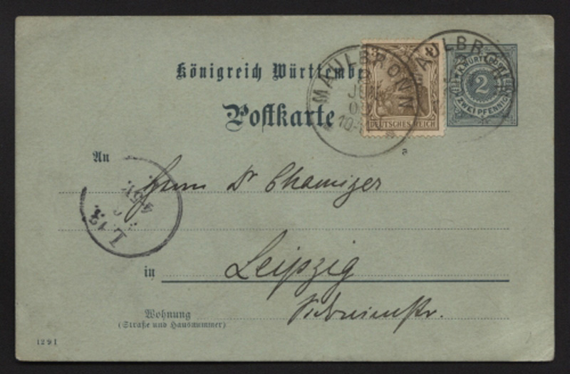 LIQUIDATIONSPOSTEN. Ganzsache Württemberg mit Zusatzfrankatur Deutsches Reich Nr. 69a, ab Maulbronn nach Leipzig.