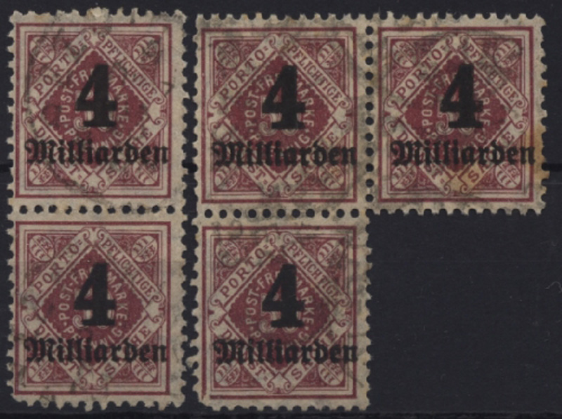 LIQUIDATIONSPOSTEN. 1923 Mi.Nr. 182 , Dienstmarken Ziffern 4 Mrd. auf 50 Pf senkrechtes Pärchen und waagerechtes Pärchen mit anhängender Marke, Zähnung unregelmäßig. Mi.(700.--)Euro.