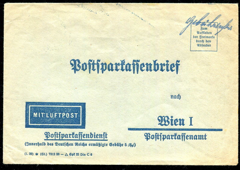 Postsparkassenbrief nach Wien per Luftpost, handschriftlich "gebührenfrei"