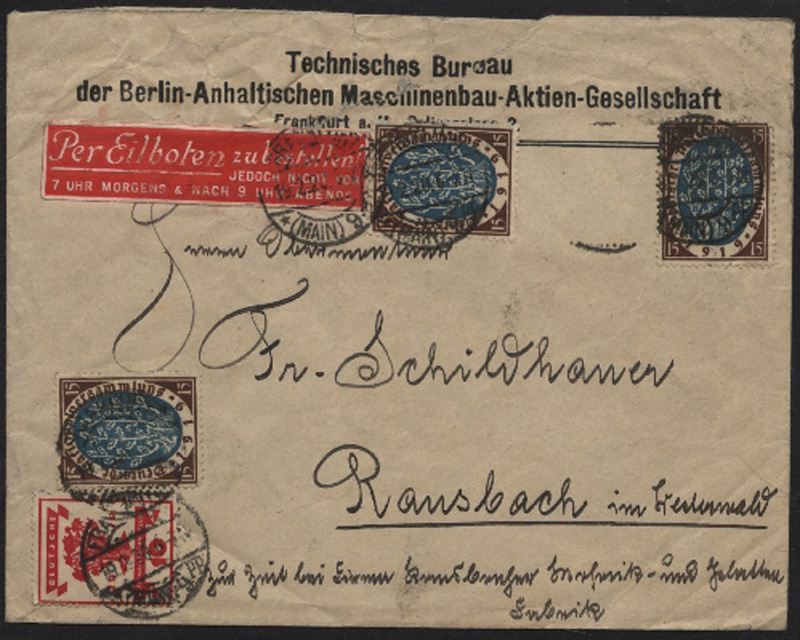 1919 Mi.Nr. 107 und 108 (3) , , Firmenbrief der Berlin - Anhaltischen Maschinenbau - Aktien - Gesellschaft ab Frankfurt/Main nach Ransbach, rs mit Siegelmarke der gleichen Firma in blau, nicht zerrissen. 1 Marke abgefallen.